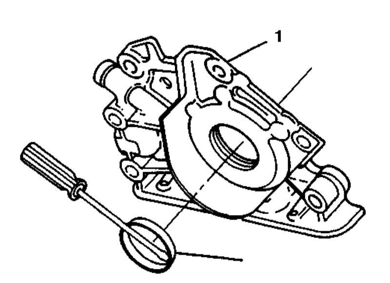 - Поддев обернутой мягкой ветошью отверткой, извлеките сальник из своего посадочного гнезда в корпусе масляного насоса (1).