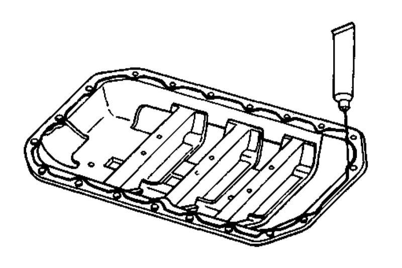- Наложите подушку герметика типа Loctite Ultra Blue 5900 на сопрягаемую поверхность посадочного фланца маслоотражателя и прижмите последний к картеру двигателя, сопрягаемая поверхность которого также должна быть тщательно зачищена и обезжирена. Проследите, чтобы герметик накладывался с внутренней стороны крепежных отверстий и с перехлестом на концах. Вверните болт крепления пластины и затяните его с требуемым усилием (9.5 Нм).