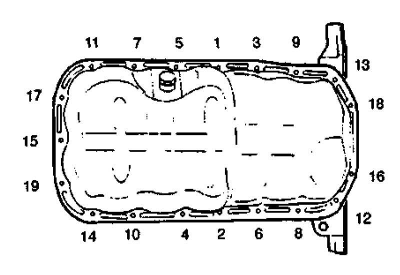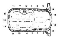 - Действуя в манере, аналогичной описанной, нанесите герметик на сопрягаемую поверхность посадочного фланца поддона, затем прижмите последний к маслоотражателю, вверните 19 крепежных болтов и, действуя строго в определенном порядке, в несколько приемов затяните их с требуемым усилием (9.5 Нм).